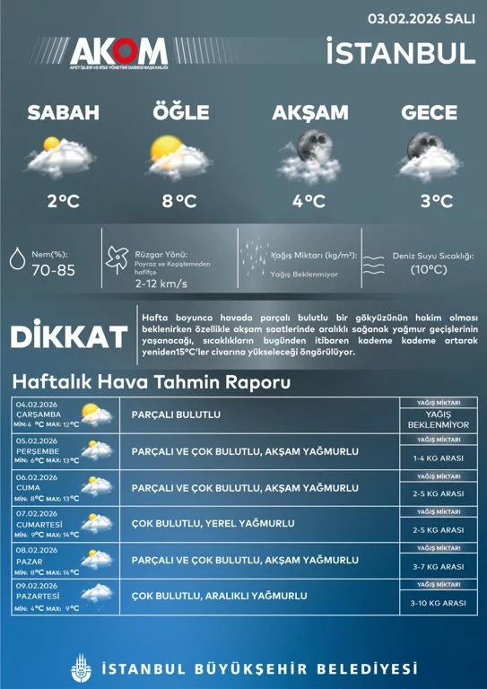 Raporun detaylarına göre, bugün (Salı) megakentte öğle saatlerinde sıcaklığın 8 derece civarında seyretmesi bekleniyor. Ancak güneşin batışıyla birlikte hava serinleyecek ve termometreler 4 dereceye kadar gerileyecek. Özellikle iş çıkış saatinde hafif yağmur geçişlerinin etkili olacağı bildirildi. AKOM yetkilileri, akşam trafiğine kalacak vatandaşların tedbirli olması gerektiğini vurguladı.