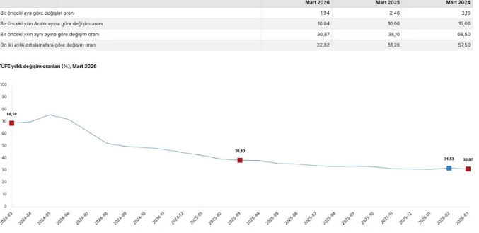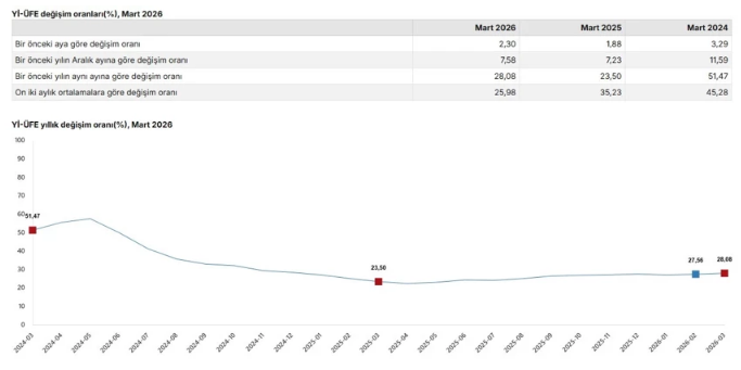 Yİ-ÜFE (2003=100) 2026 yılı Mart ayında bir önceki aya göre %2,30 artış, bir önceki yılın Aralık ayına göre %7,58 artış, bir önceki yılın aynı ayına göre %28,08 artış ve on iki aylık ortalamalara göre %25,98 artış gösterdi.